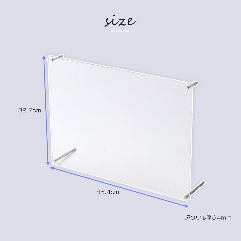 【商品仕様】 アクリル板サイズ:幅45.4cm×高さ32.7cm 厚さ4mm シャフト(上部用)長さ:100mm シャフト(下部用)長さ:50mm 素材:アクリル樹脂、スチール 重量(1枚あたり):約800g 付属品:シリコンチューブ 【生産国】 日本 【組み立て】 お客様組み立て品 【備考】 ※実際の商品の色にできるだけ近づけるよう撮影を行なっておりますが、商品の色はご使用のモニターによって実際の明るさや色と多少異なって見える場合がございます。