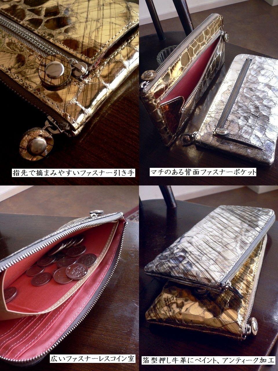 こちらはクロコの箔型押し牛革に ラインペイントした上で さらにアンティーク加工で表情を加えた 存在感のある仕上がり。